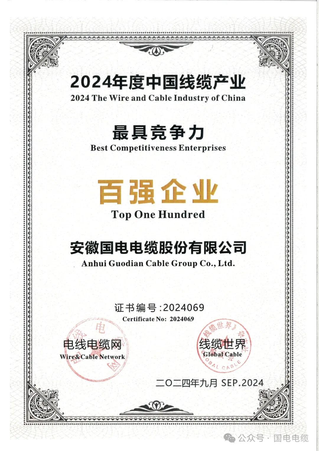 国电电缆入选2024年中国线缆产业最具竞争力百强企业